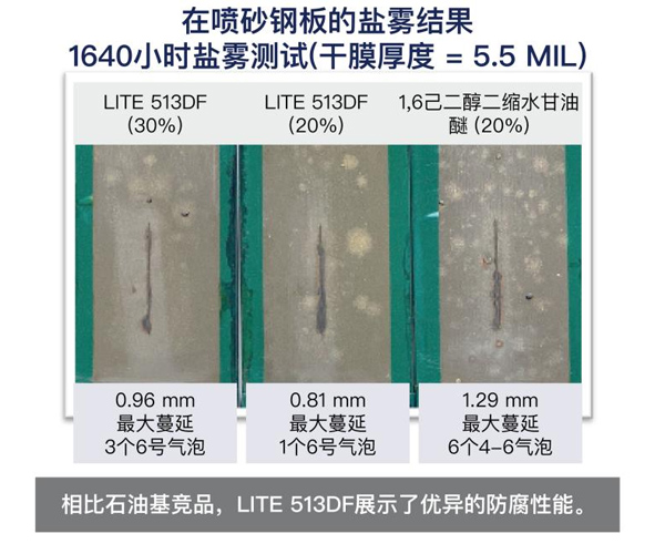 lite 513df是一款基于腰果壳油的新型高生物含量稀释剂,它的环氧当量比标准的513型号要低。这款产品适用于环氧涂料、单组分和双组分粘合剂以及复合材料。lite 513df粘度低,具有优异的稀释能力,与双酚a型液体环氧树脂的添加重量曲线如图所示。作为稀释剂,它在环境温度和低温下具有良好的硬度发展。与其他腰果壳油改性的材料类似,lite 513df具有良好的耐水性和柔韧性。在涂料应用中,lite 513df在长期盐雾试验中表现出非常好的防腐性能,请见本页面板的图片。在粘合剂应用中,这种环氧稀释剂还可作为改性剂,提高伸长率和粘结强度,同时将对tg和抗拉强度的影响降至低。